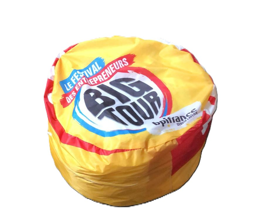 Ce pouf a été conçu à partir de chutes de toile publicitaire en spi, issues d’anciennes bâches imprimées.