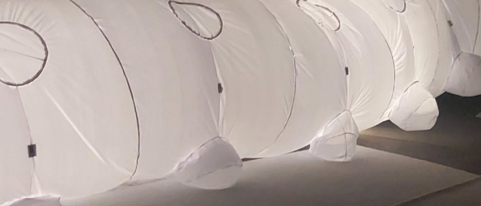Sculpture immersive de 15 mètres imaginée par Arnaud Laffond et fabriquée dans mon atelier à partir de rouleaux non conformes. Gonflable par souffleur, elle permet à l’artiste de se glisser à l’intérieur pour y projeter des vidéos, transformant l’œuvre en une chrysalide vivante. Cette création allie fabrication sur-mesure, art et technologie pour offrir une expérience sensorielle unique, mouvante et symbolique. Un projet qui incarne pleinement la notion de transformation.